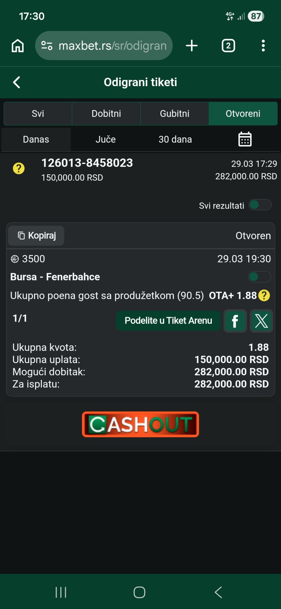 Aj da probamo uniks 1, armani 2, barsa 1 i valensija 2, sve basket. Kvota 3.8 u admiralu
