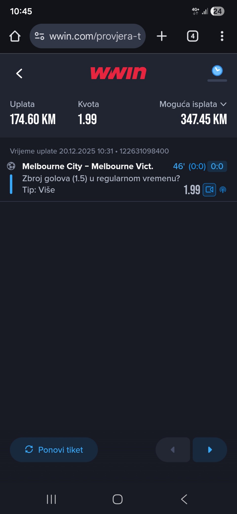 tip: over 4.5 (76 minut trenutni rezultat 0:4)
