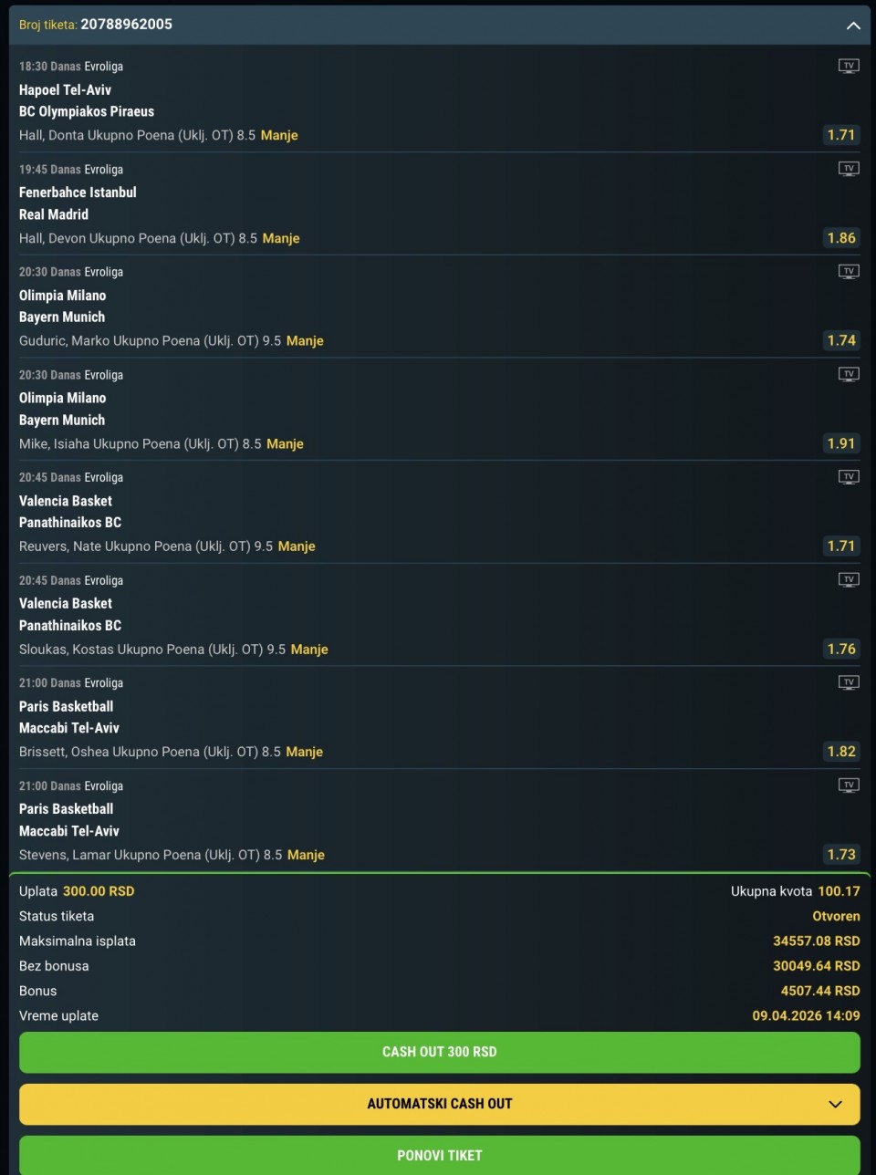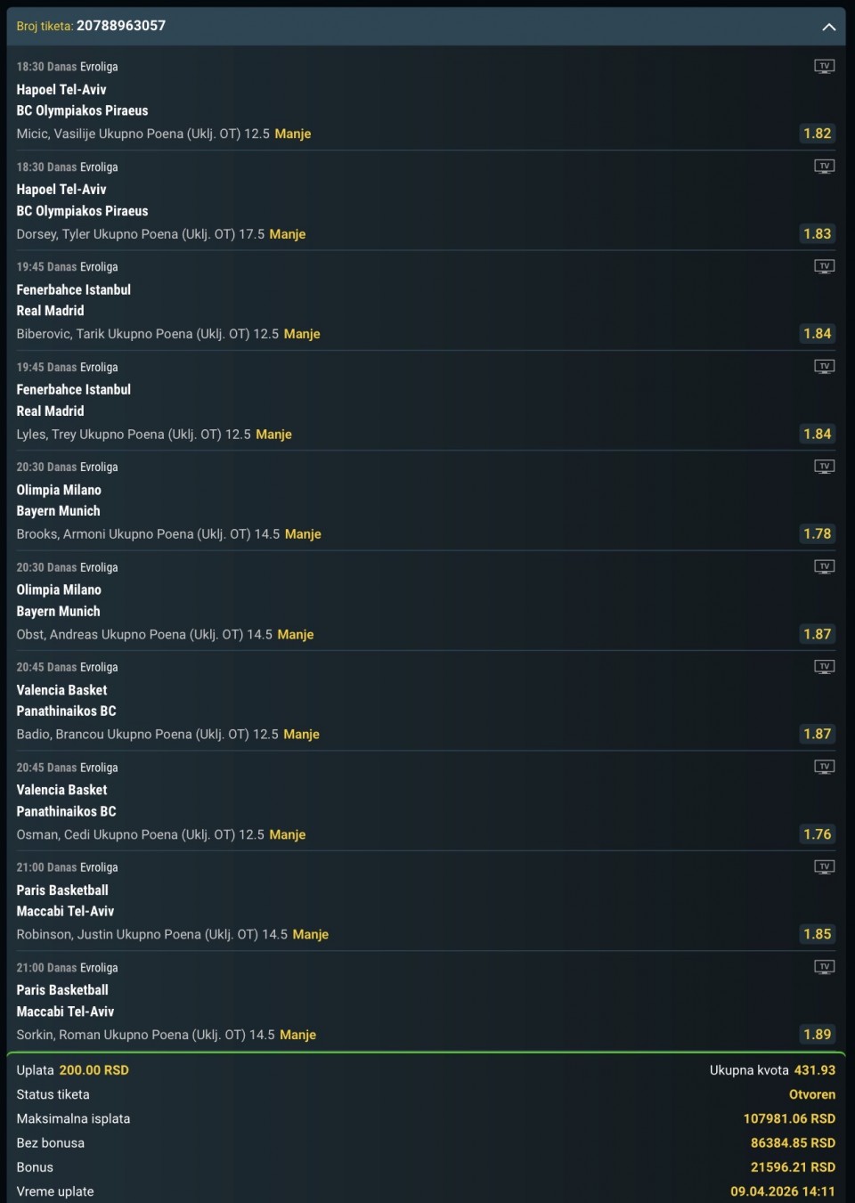 I dalje tvrdim jedan od najboljih igraca EL, proslu utakmicu se raspao sa sutom 4/16 i zavrsio je sa 10 poena mec. Imace mnogo loptu u rukama i ocekujem dosta bolje procente i vidim ga na 20ak poena.