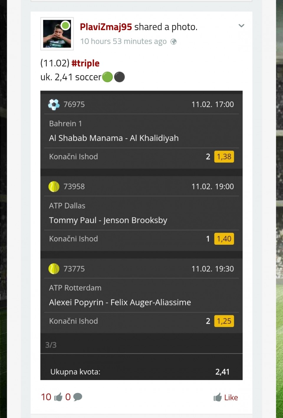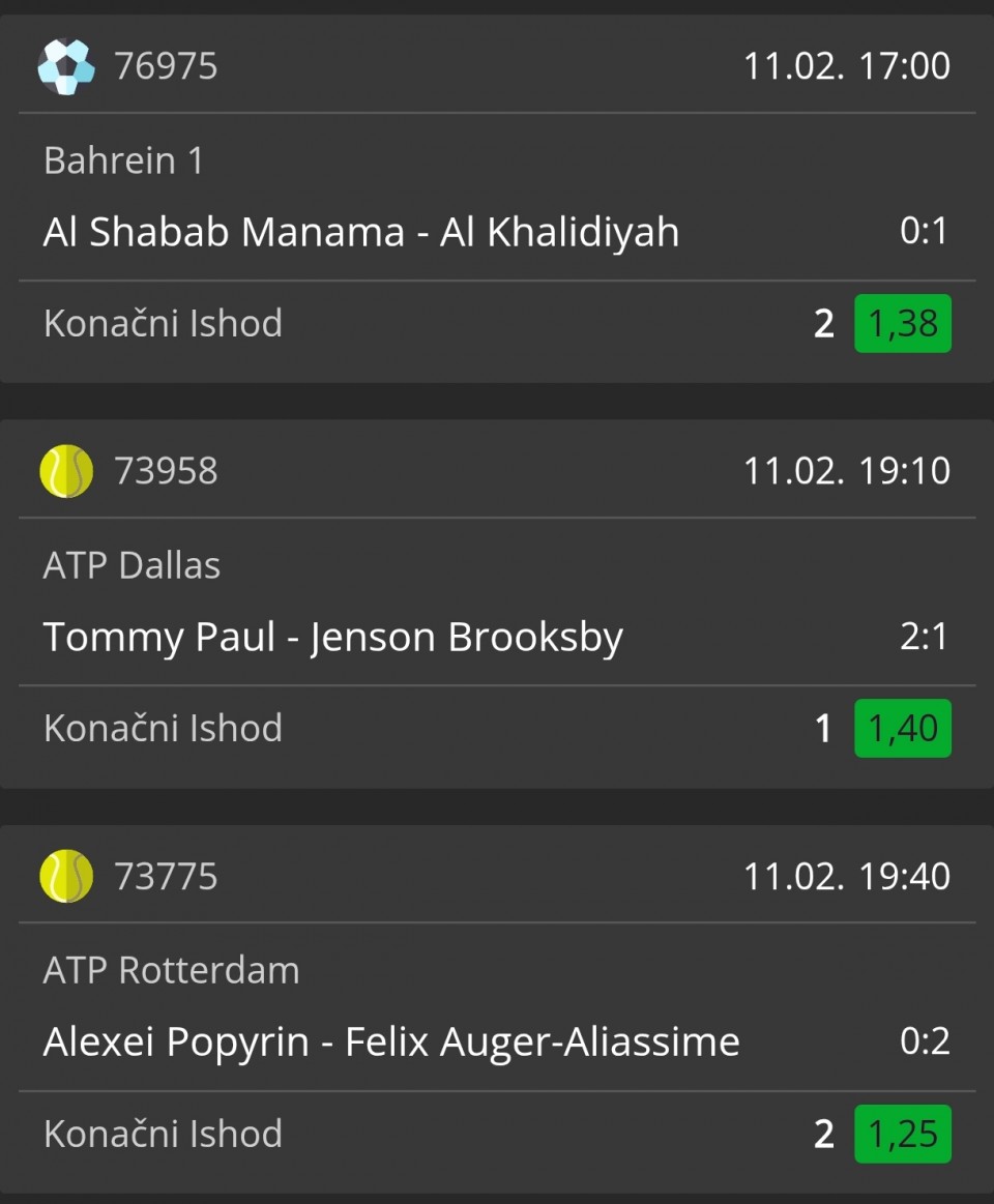 Slucajno naisao na ovaj par. Koliko vidim rumunj 3 puta zaredom igra iste meceve..Pobjeda 2:1 pa poraz 2:0. Volim ovakve "teorije zavjere" i vjerujem da danas gubi od Biletica. Ako ne 2:0, cista pobjeda se isto...🎾G.A.Boitan - I.Biletić Ki 2(1.85)
