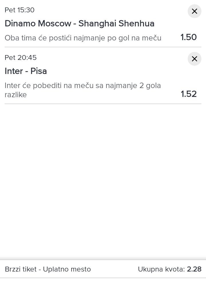 Moj ulog je malo jaci, a vi iskombinuj te sa necim da pojacate kvotu ili sa par soma na singlu....