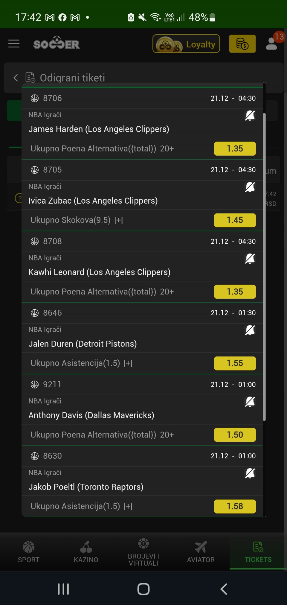 20.12.2025. 21:00h Leeds - Crystal Palace; tip: X; kvota: 3.10; uplata: 360,00 din.; isplata: 1.116,00 din.