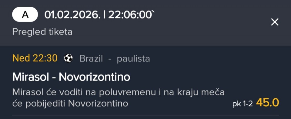 Jos jedan manje vise uspesan dan,prosao jedan tiket drugi pao zbog fejnorda koji nije mogao da postigne gol treci pao na Aston Vilu koja sa igracem vise delovala kao da ne zna gde je gol i cetvrti za sad samo na rengers, jake kvote koje sam rekao...Jos jedan manje vise uspesan dan,prosao jedan tiket drugi pao zbog fejnorda koji nije mogao da postigne gol treci pao na Aston Vilu koja sa igracem vise delovala kao da ne zna gde je gol i cetvrti za sad samo na rengers, jake kvote koje sam rekao sve dosle Levadiokos tm1 1+ Ajaks GG i Betis tm1 2+ nadam se da ste upeli nesto da ispratite Show more