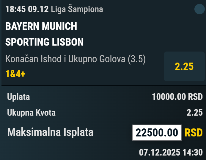 Baš zbog tog poraza protiv Arsenala, mislim da ovde sebi nikako ne mogu da dopuste još jedan kiks u LŠ u vidu neosvajanja 3 boda i da će Sporting u neku ruku "nastradati" zbog toga. Protivnik je taman po meri koji voli da se nadigrava (kada hoće i želi) i verujem da ćemo gledati jednu otvorenu utakmicu, sličnu onoj protiv Briža kada je čitav posao već bio završen maltene u prvom poluvremenu. Mali hendikep će biti neigranje Diaza koji je u dobroj formi i koji odslužuje poslednju utakmicu zbog crvenog kartona protiv PSG-a, ali mislim da će veliki plus zato biti Kane koji je "odmarao" protiv Štugarta i odigrao samo poslednjih pola sata, ali čak i tih 30 minuta mu je bilo dovoljno da postigne hat-trick...