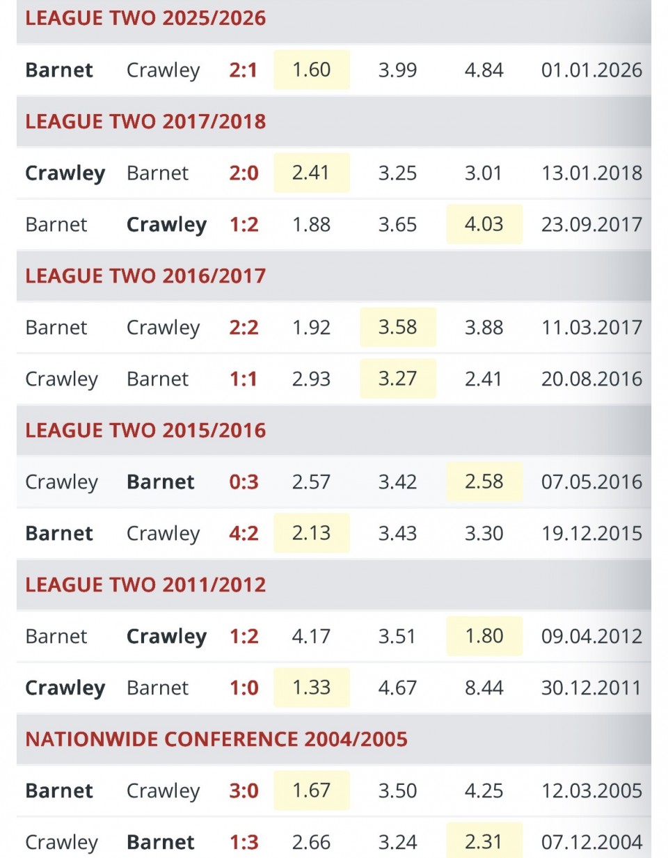 🏴 20:45 Crawley - Barnet GII1+ (1.60)/ 2 (2.00)/ 1-2 (28.00)