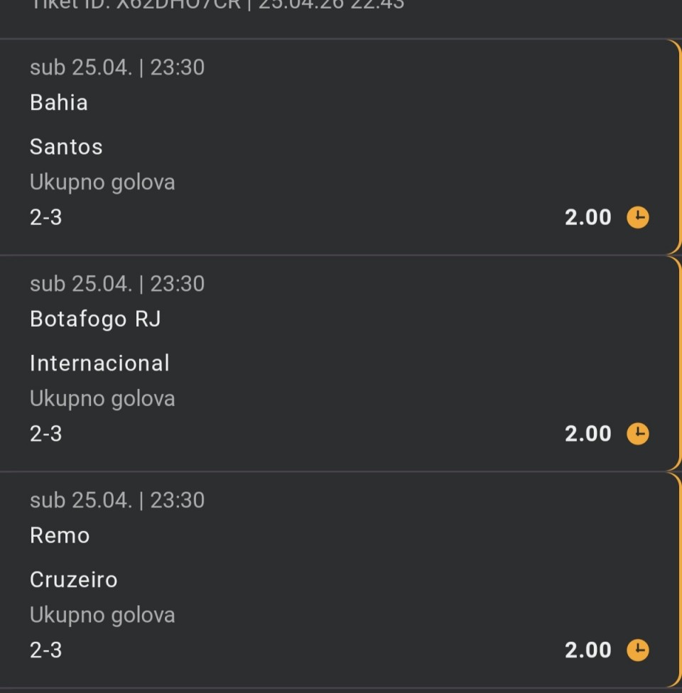 24.04.2026. 21:00h Avellino - Bari; tip: X; kvota: 3.50; uplata: 5.760,00 din.; isplata: 20.160,00 din.