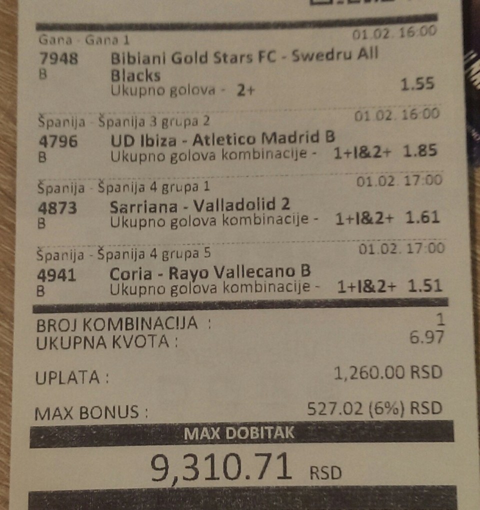 Izvinjavam se što nisam juče pre početka prvog meča stavio ovaj tiket, jer sam ga odigrao bukvalno s nogu i uplatio par minuta pre početka prvog meča. Nadam se da će proći. Na Real sam već stavio lulicu iako nije završio. 😄