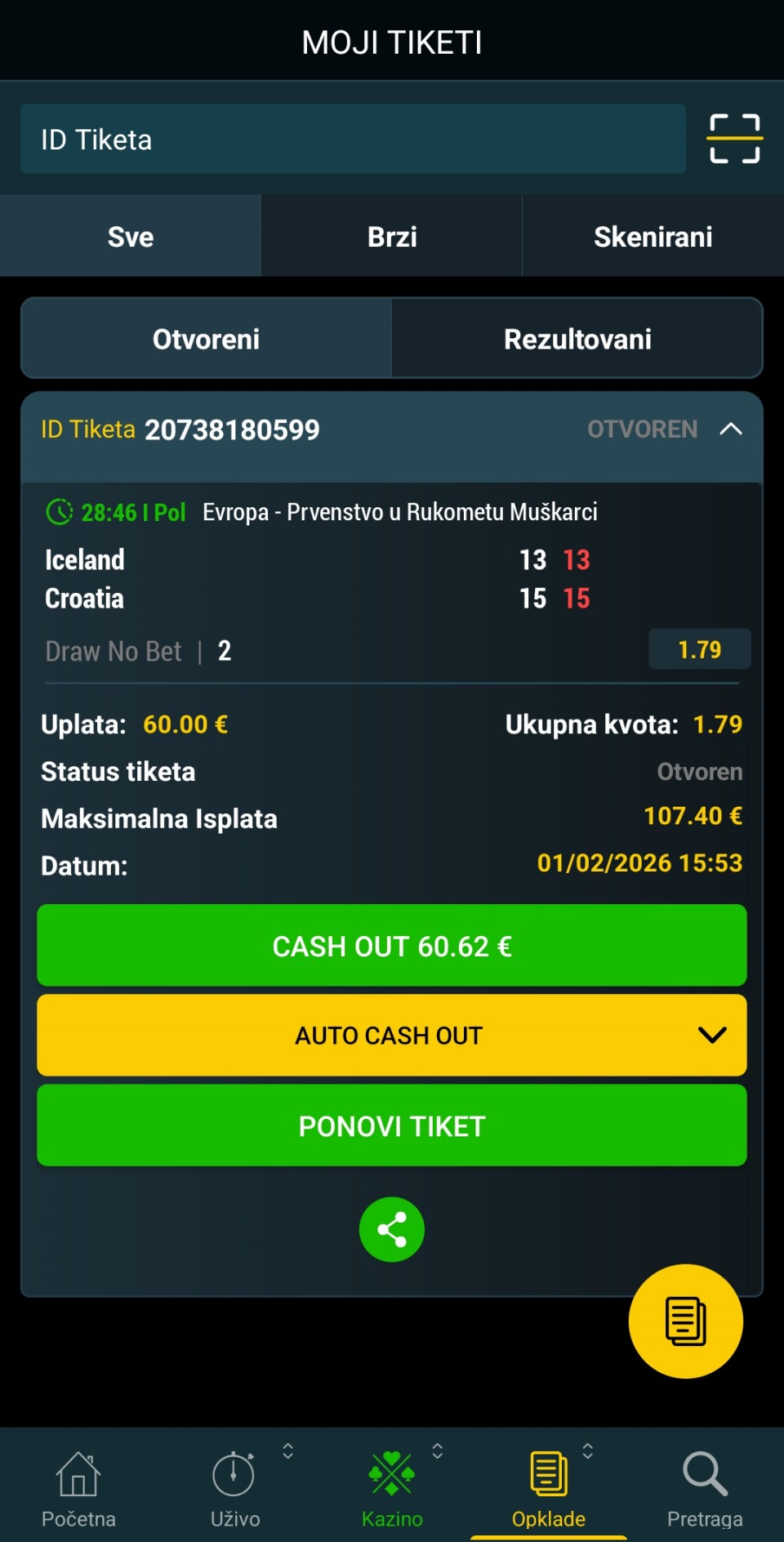 E sad ako prođe, stavio...Izvinjavam se što nisam juče pre početka prvog meča stavio ovaj tiket, jer sam ga odigrao bukvalno s nogu i uplatio par minuta pre početka prvog meča. Nadam se da će proći. Na Real sam već stavio lulicu iako nije završio. 😄