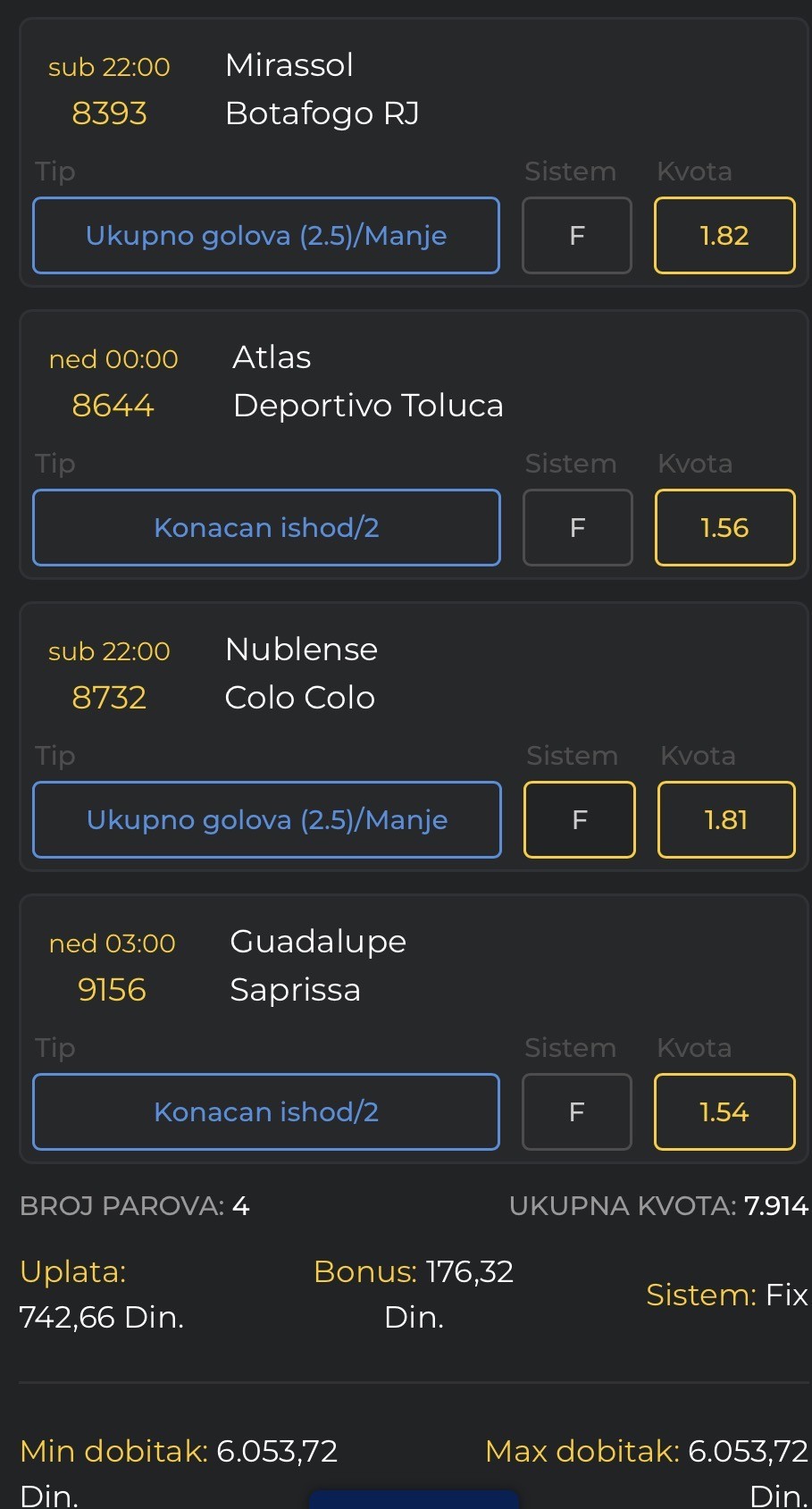 Holanđani ne baš kao što sam očekivao, doduše Ajax sam prvobitno hteo 1-3 oba poluvremena ali zbog PSV-a sinoć sam se predomislio i eto šta se desilo, Breda i Eaglesi baš slaba utakmica, a Telstar i Excelsior ispoštovali u prvom, nema veze svakako ćemo da ispravimo, loš dan