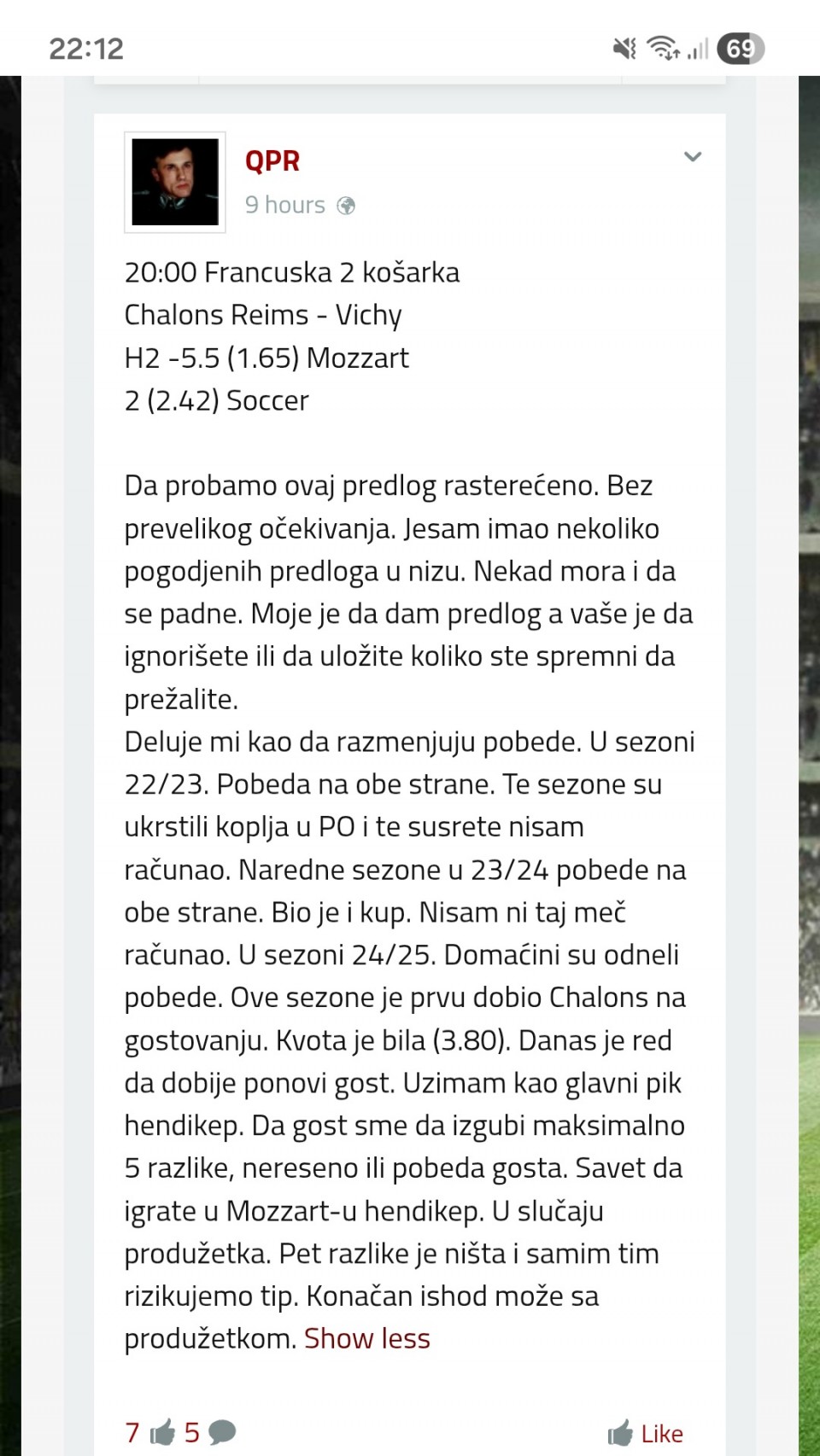 tip: over 1.5 (69 minut trenutni rezultat 1:0)