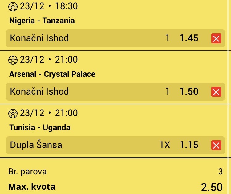 Mec koji vrlo lako moze da ode na obe strane, pogotovo Ako palas odigra kako zna, oba tima u dobroj formi s tim da je Arsenal ovde favorit...Stize i sta sam vezao kao mini tiket za fudbal veceras. Kvota 5.40