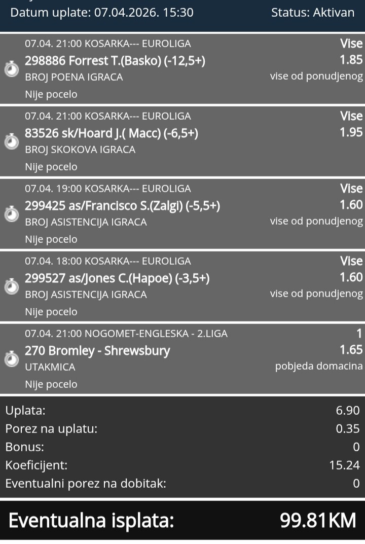 Virtus Bolonja - Bajern FTOT1 1,78 . Domaćin 6 uzastopnih poraza u svim takmičenjima i 6 poraza zaredom u Evroligi, mislim da je red za prekid tog niza, kvota je iz maxbeta, srećno!