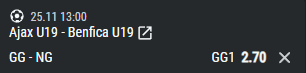 🇳🇱 13:00 Ajax U19 - Benfica U19 GI1+&2+ (1.75)