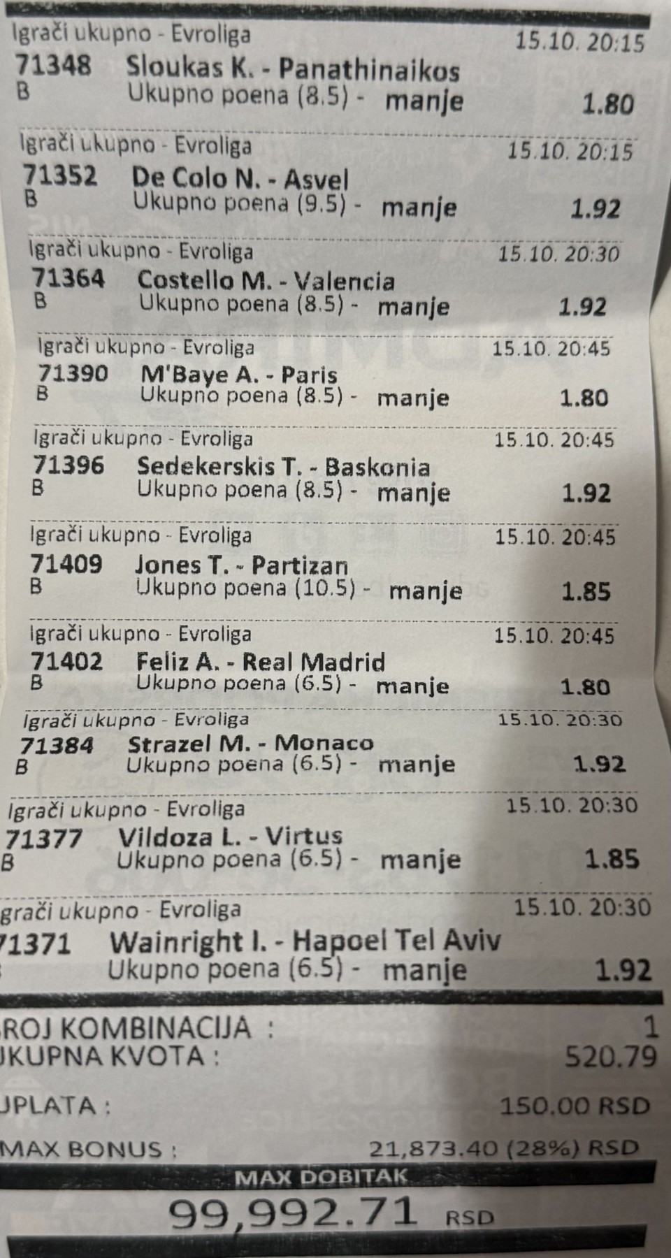 Danas je slaba ponuda, a Real Madrid veliki favorit. Sam koncept Eurolige je u najmanju ruku sumnjiv. Nadam se da Partizan neće izgubiti sa većom...Školski prelaz u Džumijevoj režiji. ✅