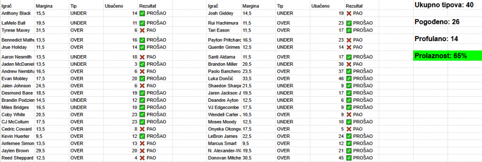 Ono što je bitno je sadržaj tabele koju vidite. 26/40 (65%) u svijetu klađenja je ozbiljan rezultat.