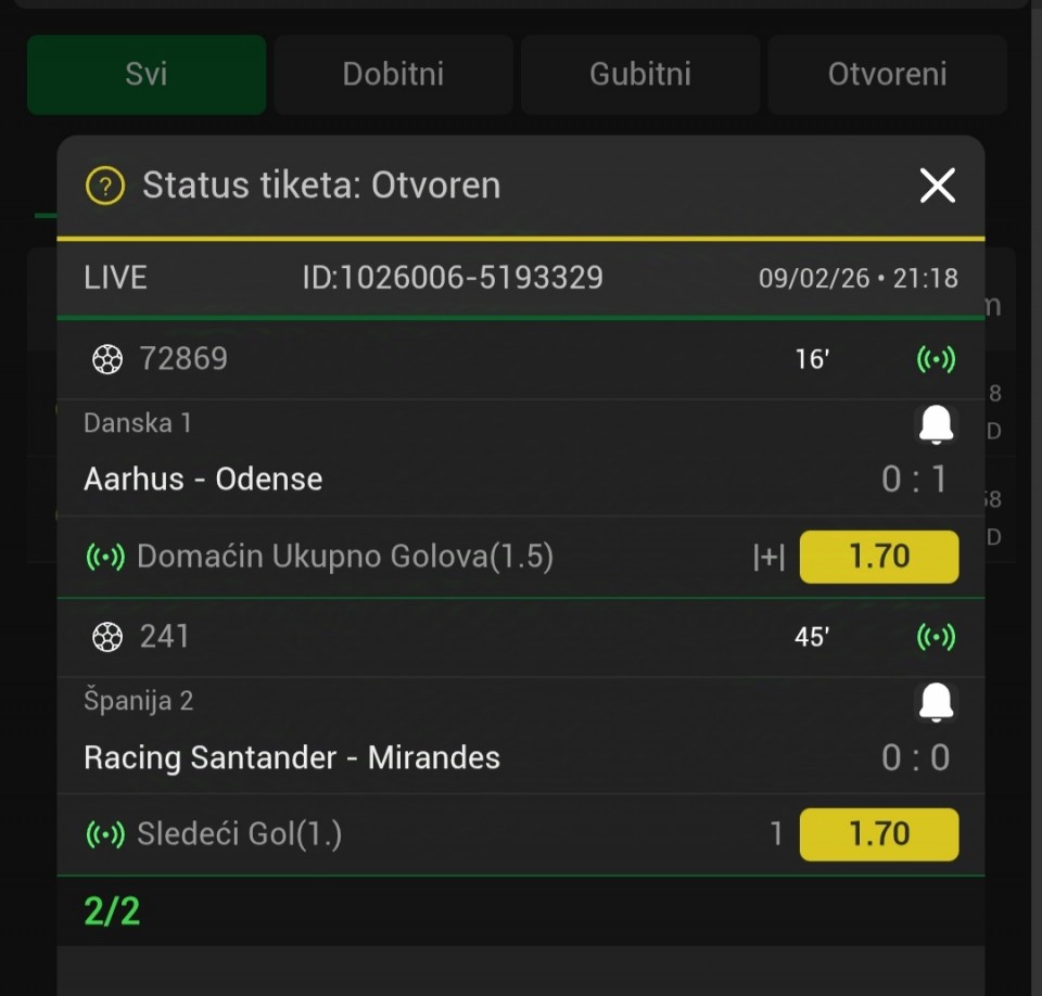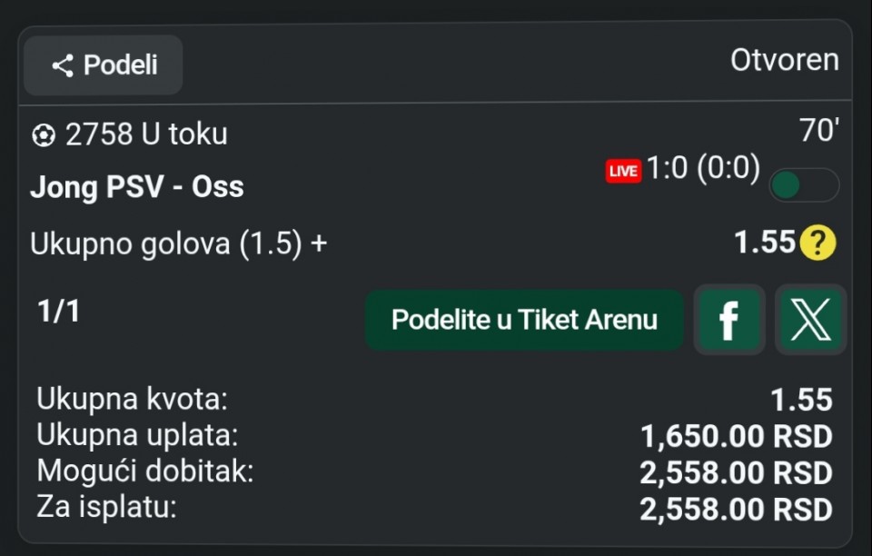 tip: tačan rezultat 1:2 (50 minut trenutni rezultat 0:2)