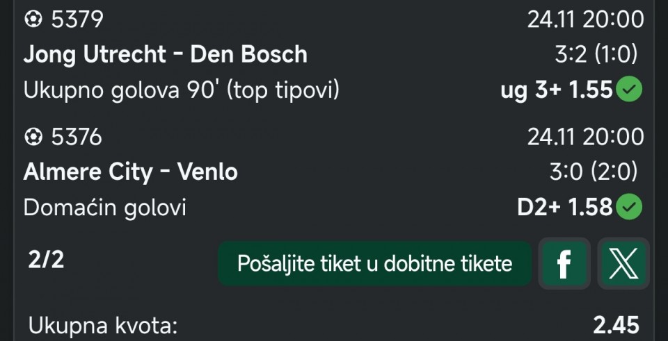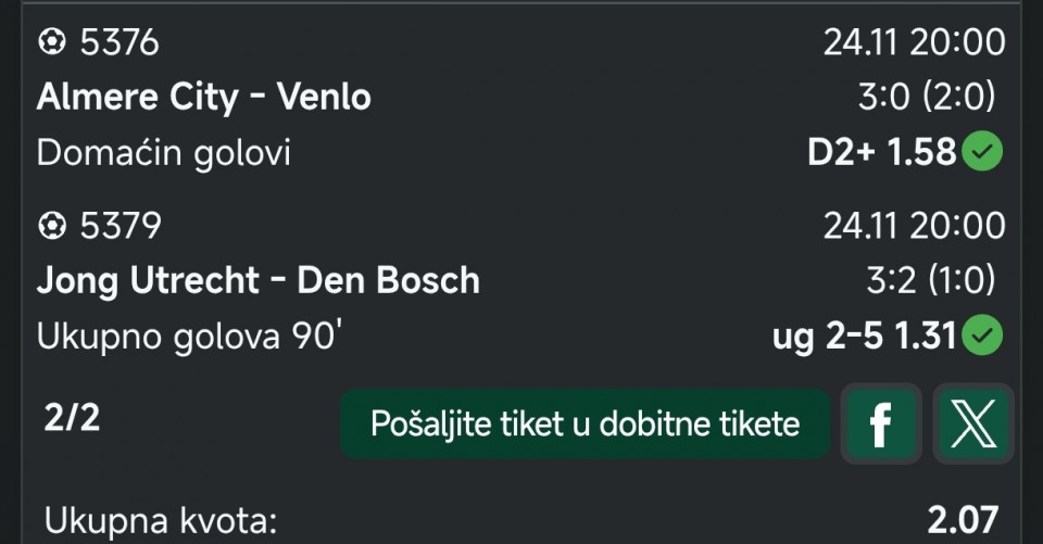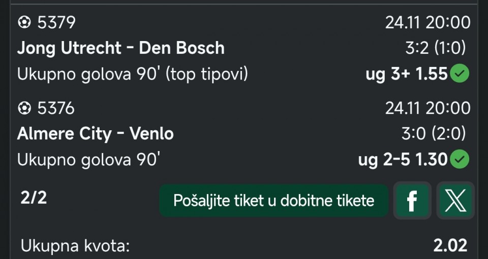 🇳🇱20:00 Jong Utrecht - Den Bosch ug 3+ (1.55) 3:2...Погођена сва три кружна тикета за данас, јутрос сам окачио на сајт али видим да ми сад нема на зиду, не знам што ни кад је нестала објава, али су ми стигле нотоификације од лајкова