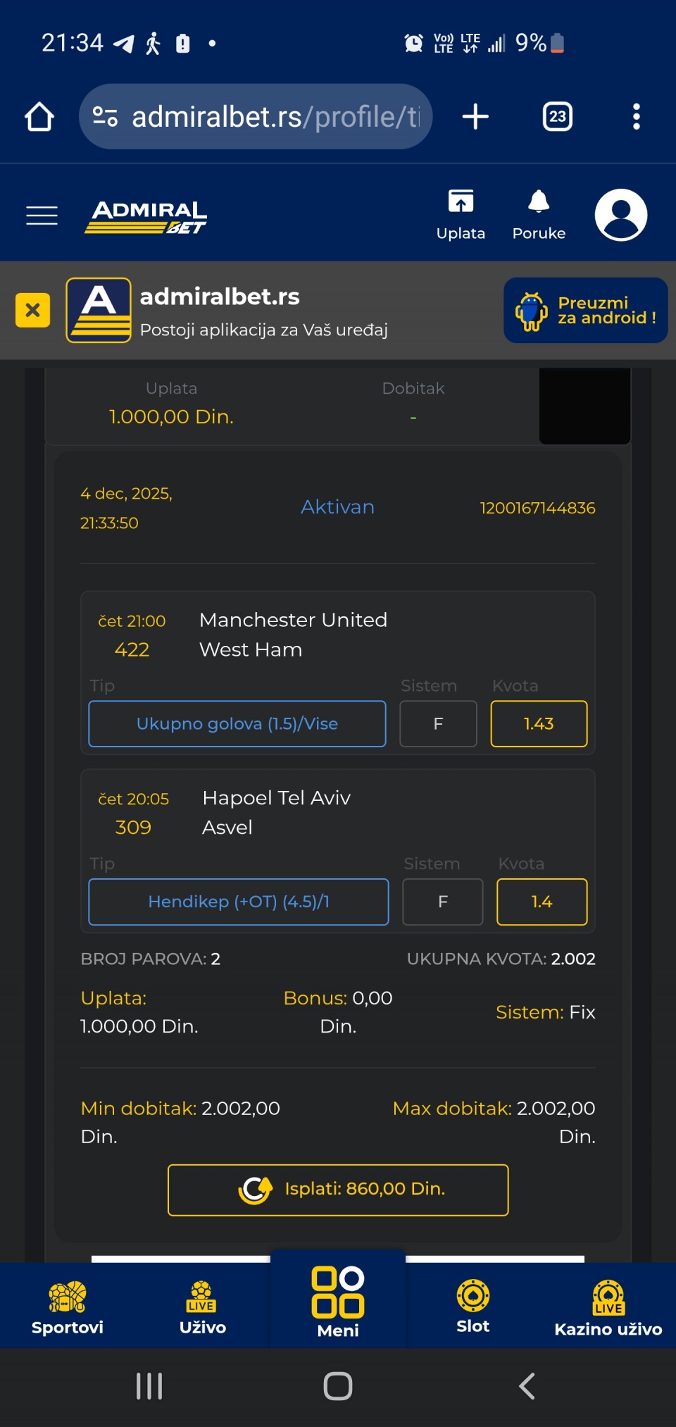 Obzirom da me bormout 1x oborio za 617 000, ponisrili im gol, sav kes bek od 10200 ulazem na ovo. Mecevi su jasni, necu pametovati veceras sa parovima. Timovi su znatno jaci, pa se nadam da xe doci u nasu korist. Srecno ko prati. 😉😉
