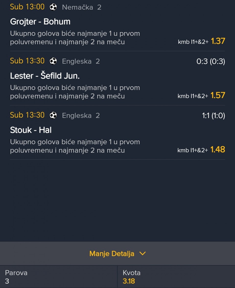 Braco braco braco Nadam se da ste sinoc naplatili Superbet tiket kao sto sam i ja. J.Edwards ostao na ukupnom PSA od 5 tako da je analiza bila na mestu i daleko ispod nase granice od 16.5. Svi ostali betovi su bili prvo poluvreme i ispostovali bez... Show more