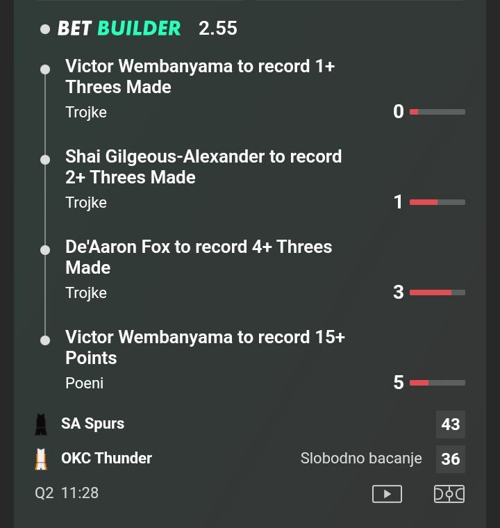 🔹️D.Fox (San Antonio) Ukupno postignutih trojki +1,5 (1,58)