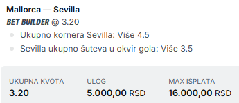 Korneri - Sevilja izvodi preko 5 kornera u proseku po utakmici čitave sezone, a to održava i na poslednjih 10 utakmica gde na samo jednoj nije uspela da izvede 5 kornera (protiv Valensije koja i inače igra malo zatvorenije). Majorka je idealan protivnik što se tiče kornera jer dozvoljavaju (pored Levantea) najviše kornera u ligi - preko 6 po utakmici. Protivnici ovu granicu na njihovim utakmicama u ligi od 5 kornera prelaze sve više i više - 8 na poslednjih 10, ali zato 100%25 učinak na poslednjih 5. H2H susreti što se tiču kornera za Sevilju su takođe dobri - 5 kornera izvode na 4 od poslednjih 6 utakmica, a na te dve koje nisu došle izveli su 4 kornera...