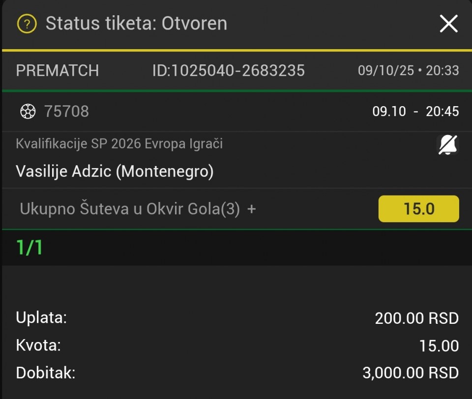 Sa termina u 18h pao dubl, ali prošao singl Leo Walta 1.5+ šuteva u okvir gola (5.65) ✅
