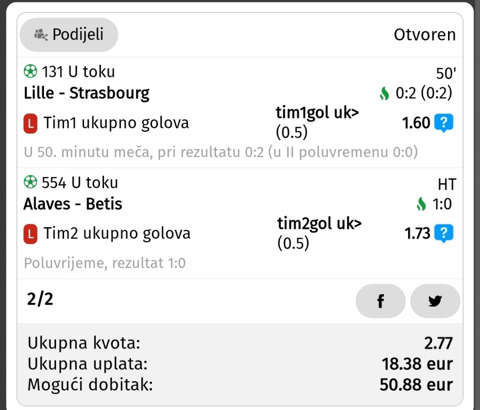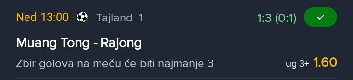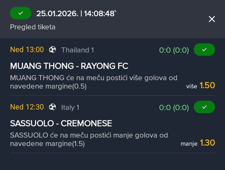 25.01.2026. 16:45h Utrecht - Sparta Rotterdam; tip: X; kvota: 3.55; uplata: 360,00 din.; isplata: 1.278,00 din.