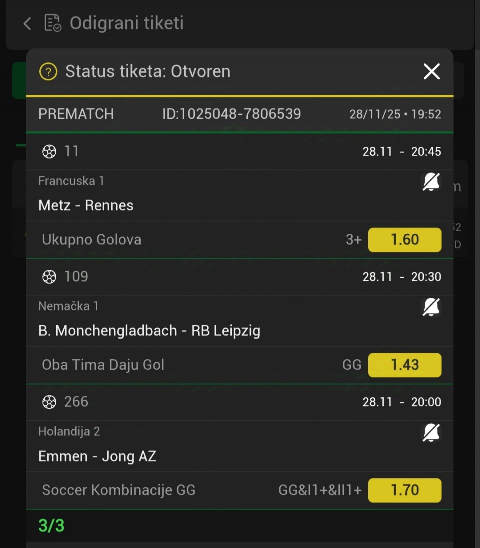 28.11.2025. 20:30h B. Monchengladbach - RB Leipzig; tip: X; kvota: 4.00; uplata: 180,00 din.; isplata: 720,00 din.