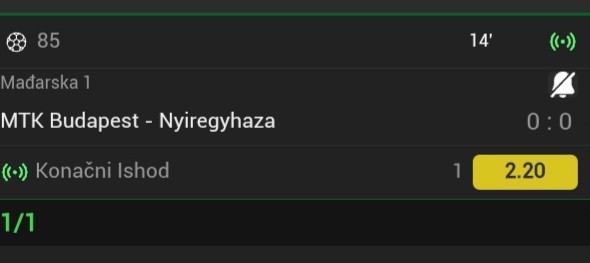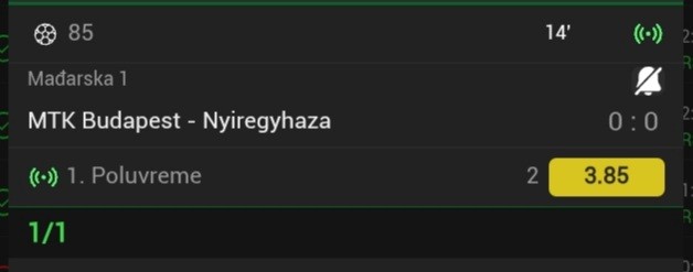 Zanimljiv niz nekoliko utakmica unazad. Samo domacin dobija. Bio je prelaz za MTK. Da probamo dvojku prvo. Ako dodje. Dobitak da prebacimo u lajvu na keca. Nadam se da ce MTK danas uzeti 3 boda jer bi bili na dobroj poziciji na tabeli.