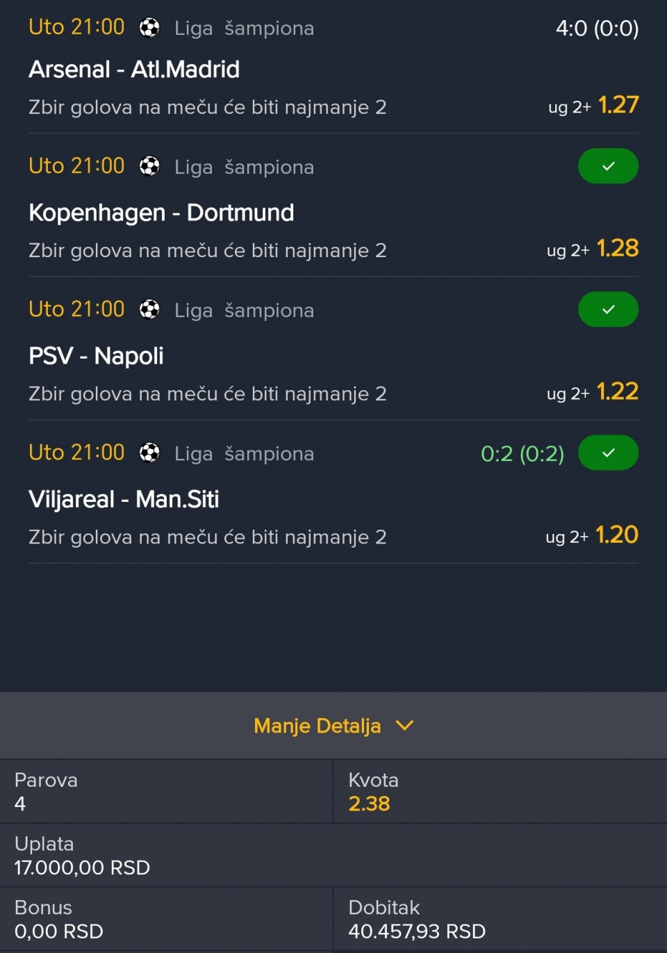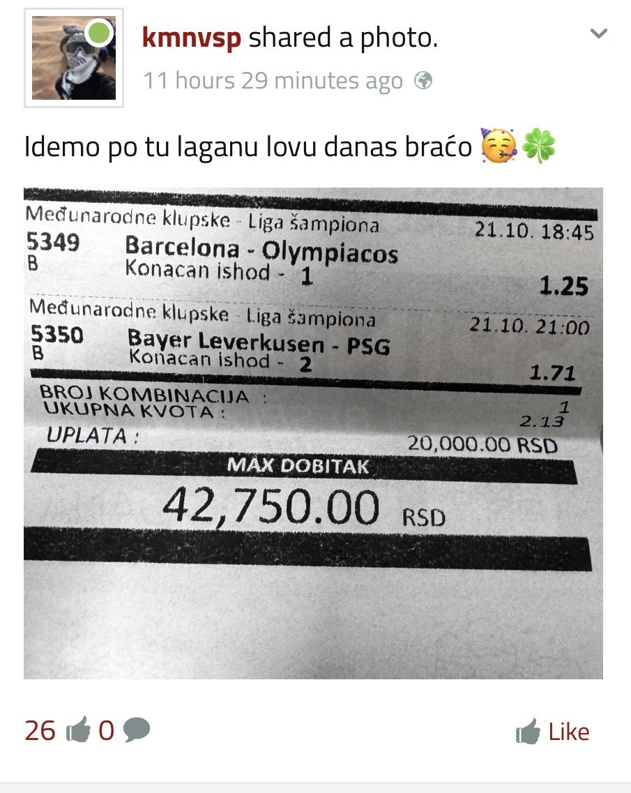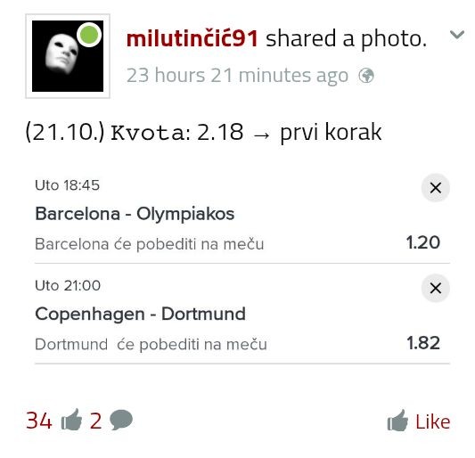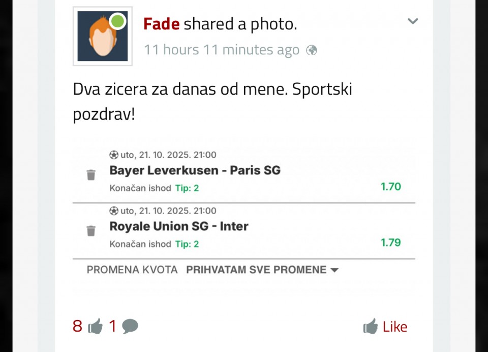Da pohvalim javno clana Dusan- Le sto je danas predložio York GG i X jer je video da dolaze u medjusobnim samo ti znaci. Ja sam ih na pauzi igrao tr 2:2 na kvoti oko 6. Nije neki dobitak ali hocu da pohvalim clanove koje kao ja vole da procackaju...Da pohvalim javno clana Dusan- Le sto je danas predložio York GG i X jer je video da dolaze u medjusobnim samo ti znaci. Ja sam ih na pauzi igrao tr 2:2 na kvoti oko 6. Nije neki dobitak ali hocu da pohvalim clanove koje kao ja vole da procackaju sumnjive utakmice i podele sa nama. Svako ko to radi. Zna koliko je naporno da se nadje bar jedna utakmica. Tako svima nama olaksa posao. Pogadjao sam i vece kvote i prelaze. Ali ovakve utakmice su mi uvek bile najdraze. Nadamo se u bliskoj buducnosti jos brdo ovakvih sumnjivih meceva. 🍻 Show more
