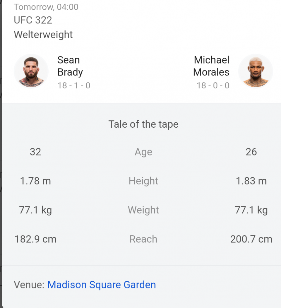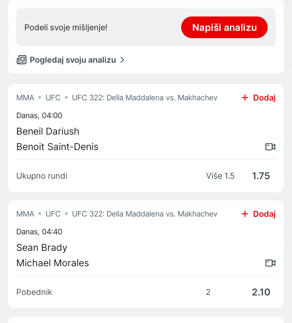 Prvi meč verujem da ide dve runde ili do kraja,a za Moralesa šta reći, trenutno najperspektivniji mladi borac u UFCu 99god. I dalje neporažen,18 pobeda od toga veliki deo nokautom u prvoj,dečko je suv mišić i surovi ubica i ne znam što je ovakva kv...Prvi meč verujem da ide dve runde ili do kraja,a za Moralesa šta reći, trenutno najperspektivniji mladi borac u UFCu 99god. I dalje neporažen,18 pobeda od toga veliki deo nokautom u prvoj,dečko je suv mišić i surovi ubica i ne znam što je ovakva kv na njega ali rado ću je iskoristiti,sportski pozdrav! Show more