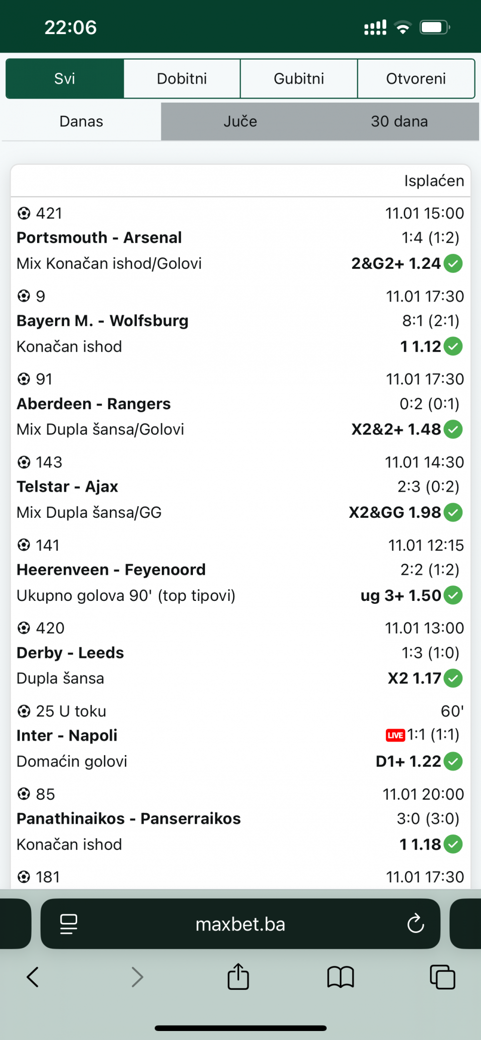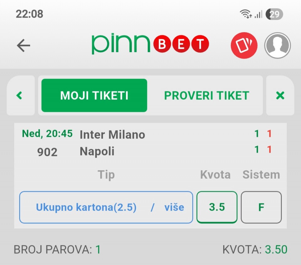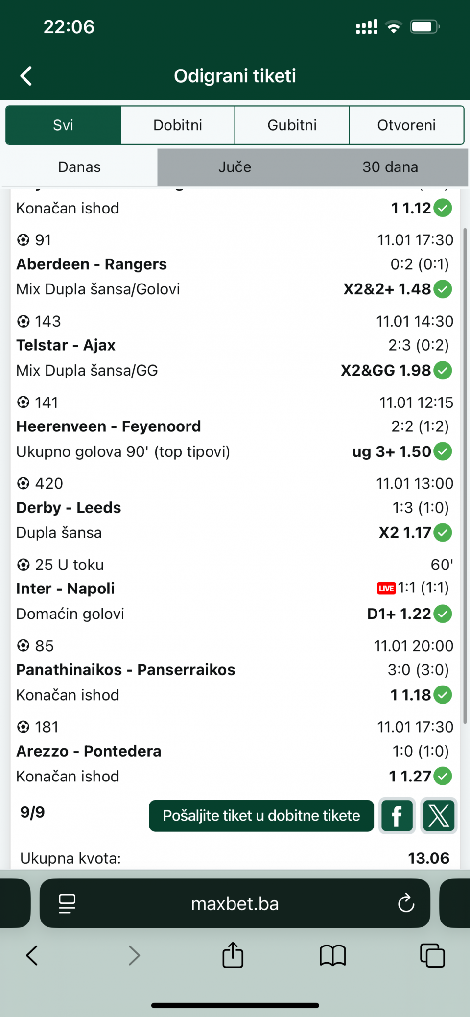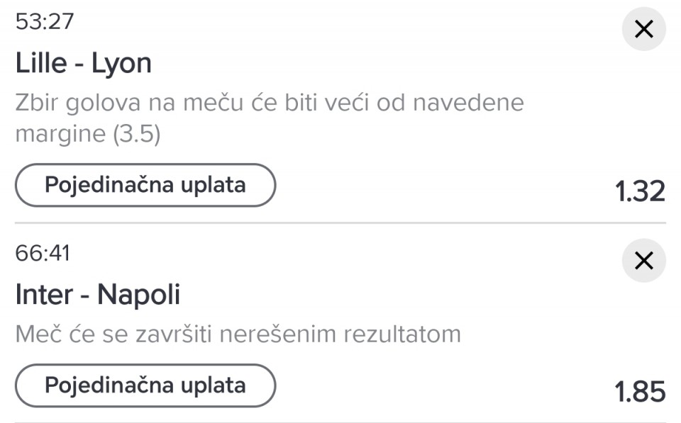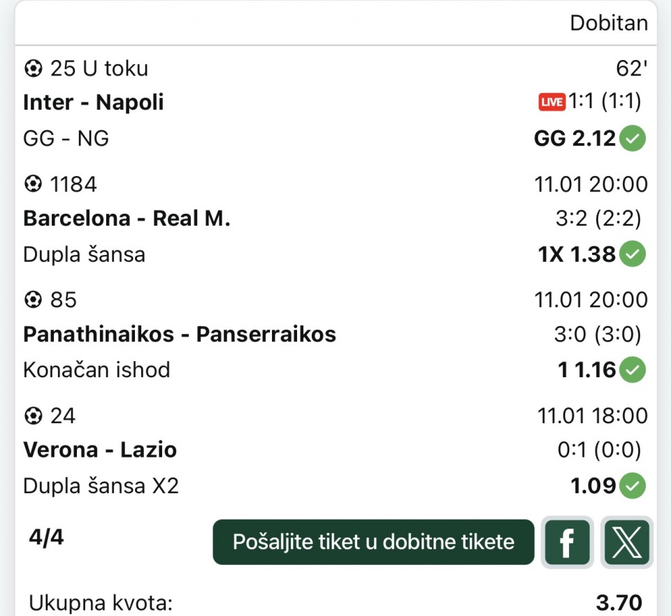 Evo za danas dva tiketa da se isprati ukupne kvote prvi @3.49,