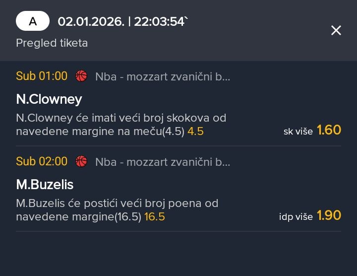 Tisma over 10,5 koef over 1,85-POGODENO...zbroj poena Mihailović Vladimir 19,5 over koef 1,85-29