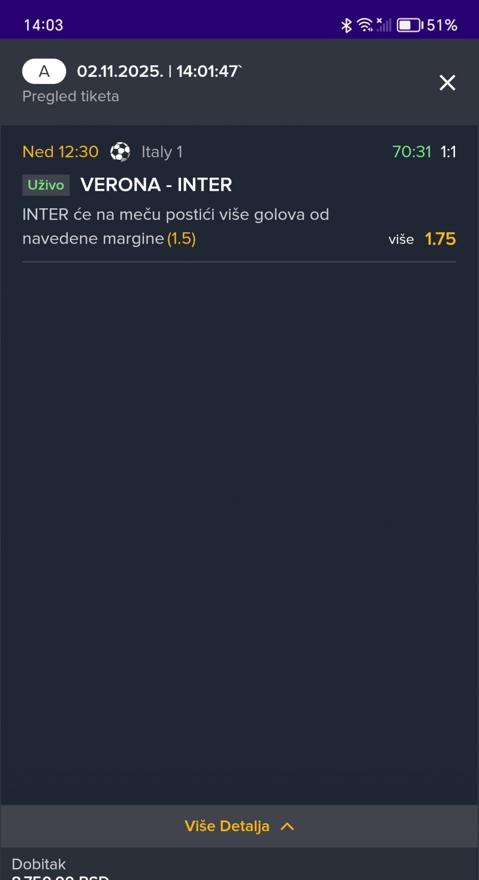 tip: over 3.5 (72 minut trenutni rezultat 1:2)