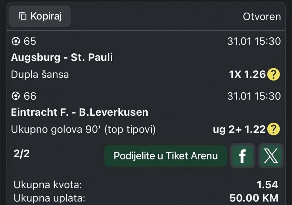 31.01.2026. 15:30h Eintracht Frankfurt - Bayer Leverkusen; tip: X; kvota: 3.80; uplata: 180,00 din.; isplata: 684,00 din.