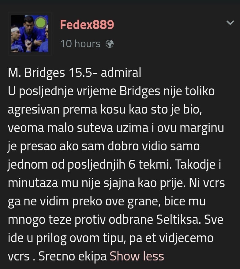 U posljednje vrijeme Bridges nije toliko agresivan prema kosu kao sto je bio, veoma malo suteva uzima i ovu marginu je presao ako sam dobro vidio samo jednom od posljednjih 6 tekmi. Takodje i minutaza mu nije sjajna kao prije. Ni vcrs ga ne vidim preko ove grane, bice mu mnogo teze protiv odbrane Seltiksa. Sve ide u prilog ovom tipu, pa et vidjecemo vcrs . Srecno ekipa