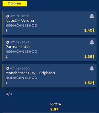 07.01.2025. 20:45h Torino - Udineze; tip: X; kvota: 3.05; uplata: 2.880,00 din.; isplata: 8.784,00 din.