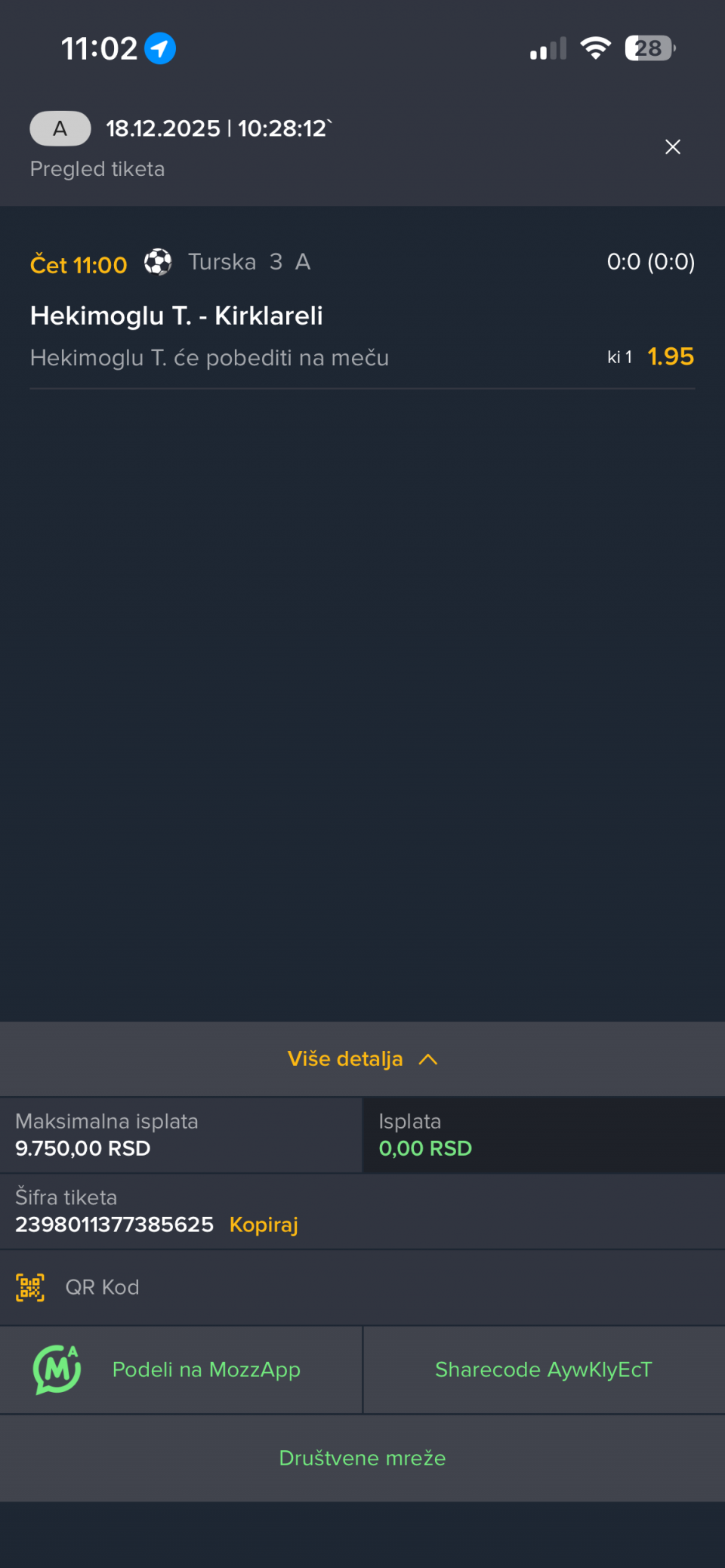 Pozdrav ljudi, hteo bih da podelim sa vama jednu strategiju za kladjenje. Dugo sam imao problema da pronadjem strategiju koja ce mi dugorocno donositi profit i konacno sam je pronasao. Vrlo je prosto, ulog je stalno 2k a kvota je minimum 2.50 sa...Pozdrav ljudi, hteo bih da podelim sa vama jednu strategiju za kladjenje. Dugo sam imao problema da pronadjem strategiju koja ce mi dugorocno donositi profit i konacno sam je pronasao. Vrlo je prosto, ulog je stalno 2k a kvota je minimum 2.50 sa tim da se tolerise i do 2.30 iz razloga sto ce u dosta slucajeva kvota biti veca od 2.50 pa ce se tu nadoknaditi profit. To moze biti singl, dubl, tripl sta god vam odgovara. Da biste bili u profitu treba da pogodite 40 od 100 tiketa. U poslednjih 100 pogodio sam 44 tiketa i ostvario profit od 31k. Nadam se da sam nekom dao ideju za dugorocno kladjenje. Pozdrav svima. Show more