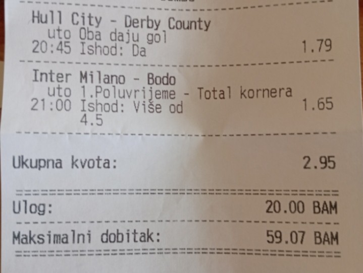 Uopšte nisam siguran da Inter može da prođe Bodo i plasira se u 1/4 finale jer Bodo napreduje iz godinu u godinu i svake sledeće sezone igra sve bolje protiv sve jačih protivnika i svakom novom pobedom postavlja nove rekorde i pomera granice. Svi su maltene govorili i da će Atletiko da ih odere jer kao sad ne igraju na domaćem terenu i veštačkoj travi, pa znamo kako se to završilo. Postojala je i opcija GG&3+ i +1.5 na Bodo sa malo većom kvotom, ali eto za svaki slučaj ovaj tip ako se slučajno završi 3:1 na kraju...