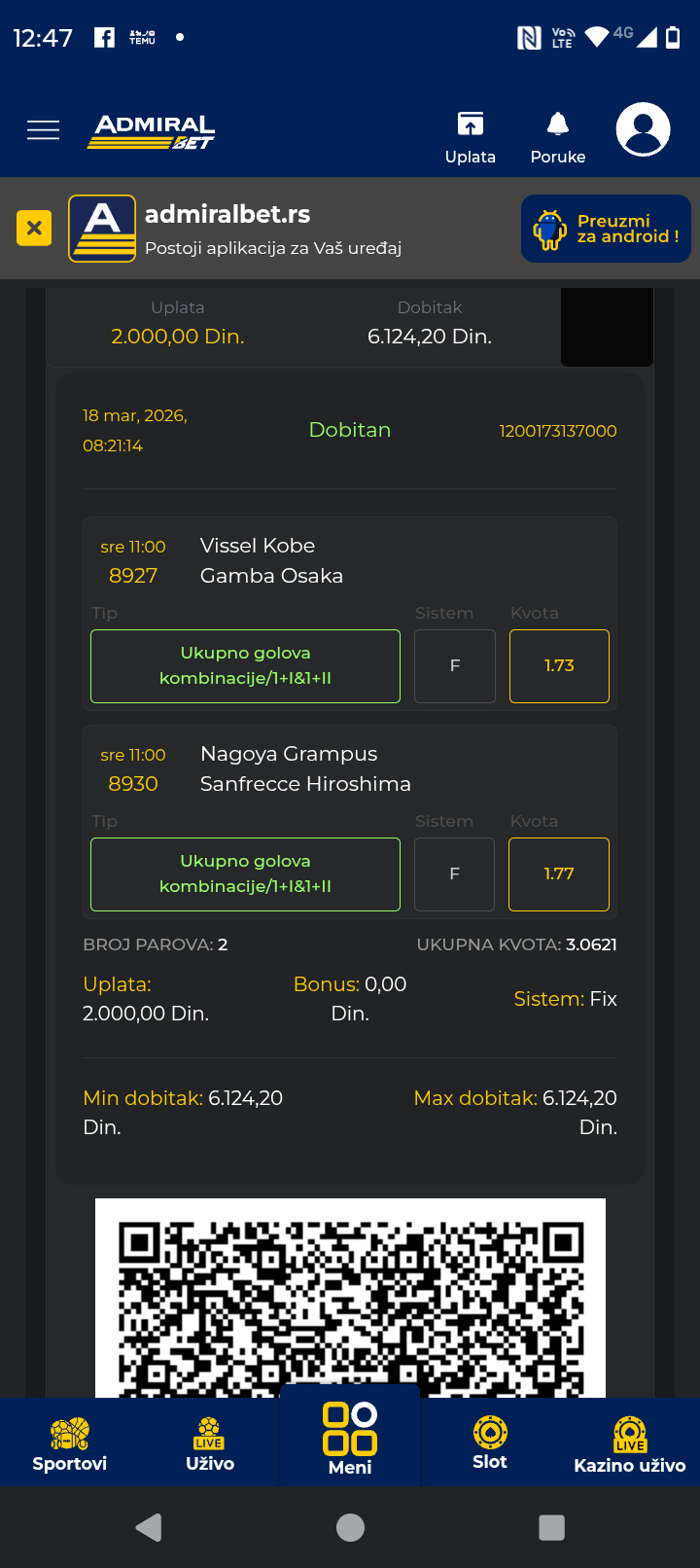 18.03.2026. 19:00h Frosinone - Bari; tip: X; kvota: 4.70; uplata: 180,00 din.; isplata: 846,00 din.