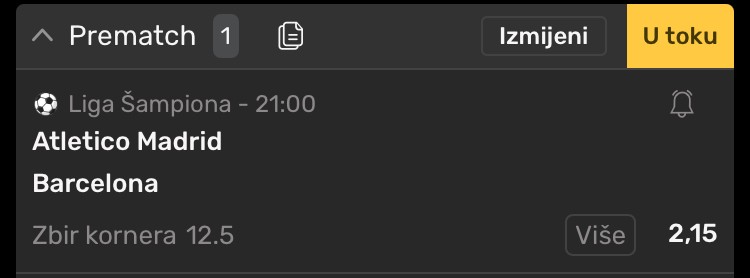 Nesto gledam ove medjusobne Atletika i Barselone i primetio sam da imaju dosta prelaza 1/2 i 2/1. Barsa je poslednji prelaz u gostima imala prosle godine u augustu sa Levanteom 2:0 / 2:3. Vuče me na prelaz večeras 1/2, cak nije iskljuceno da ovo...Nesto gledam ove medjusobne Atletika i Barselone i primetio sam da imaju dosta prelaza 1/2 i 2/1. Barsa je poslednji prelaz u gostima imala prosle godine u augustu sa Levanteom 2:0 / 2:3. Vuče me na prelaz večeras 1/2, cak nije iskljuceno da ovo zavrsi tipa 1:0 / 1:3 pa da se igraju produzeci. Poslednji njihov prelaz bio je prosle godine kada je Atletiko vodio 2:0 a na kraju zavrsilo 2:4. Pre toga Barselona vodila 1:0 kuci, Atletiko pobedio 1:2. Ima potencijala i da veceras nesto odrade, pa treba ispratiti bar na siću.