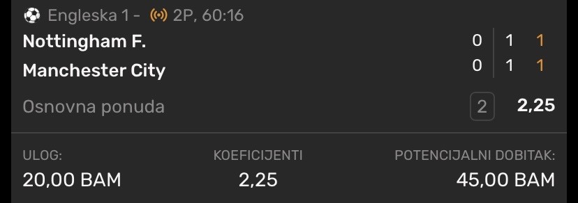 Live: Nott forest-city 1X 1.85 kv. Dosta puta u zadnjih nekoliko kola kiknuo arsenal,vreme je i city da kiksne. Prvo poluvreme bledo,rani termin od 13:30 svi igrali 2 i golove sve jasno, i na kraju bice jebo te mancesta 💪🤣