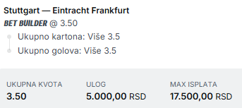 Što se tiče kartona, mislim da stvarno ne bi trebalo da bude problema da sudija pokaže bar 4 kartona. Kao prvo na poslednja 3 H2H duela je pokazano minimum 4 kartona. Kao drugo na obe utakmice za vikend u kojima su učestvovali Štutgart i Frankfurt je pokazano 6 kartona. Kao treće na poslednjih 6 utakmica Štugarta na svom terenu je pokazano 4+ kartona, kao i na 3/5 Frankfurta u Bundesligi. I kao četvrto sudija Jolenbek - ove sezone pokazuje nešto preko 3 kartona u proseku, ali već je sudio Frankfurtu i Štugartu i na obe te utakmice je pokazao minimum 4 kartona. A kako je ovo maltene direktna borba za Evropu i LŠ sledeće sezone, očekujem da se i ovde malo zakuva na terenu..