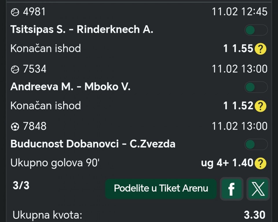 11.02.2026. 20:00h Bari - Spezia; tip: X; kvota: 3.20; uplata: 360,00 din.; isplata: 1.152,00 din.
