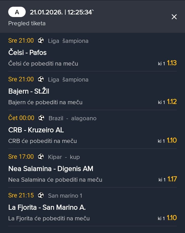 Pozdrav ekipo! Prošla je još jedna noć elitnog fudbala. Generalno možemo biti zadovoljni jer smo čitali igru dobro u većini mečeva, ali falila su ta dva rezultata za "jackpot".