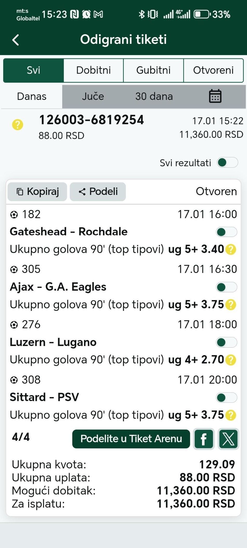 To je to ekipa za danas Dubl prošao. Ostala tri para dva prošla jedan pao nadam se da ste uzeli lovu. Do sutra sportski pozdrav