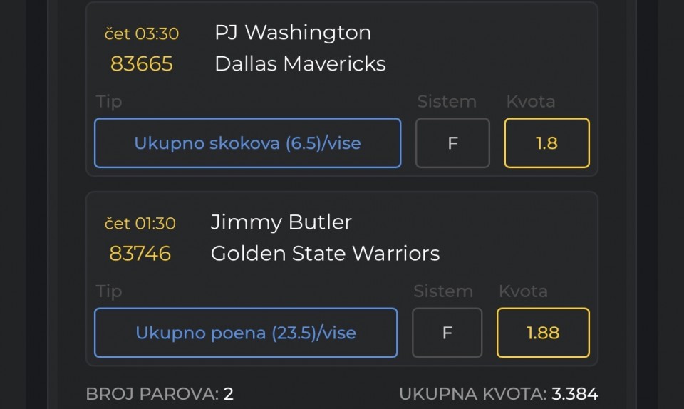 Još jedan u nizu užasnih padova. Harper, koji na minut do kraja 3. četvrtine ima 16 poena (granica 19,5) uspeva da iznudi faul na šutu za 3, ali se u istom trenutku i povredi i završava svoje učešće na utakmici. Ovo su padovi na koje niko od nas ne...Još jedan u nizu užasnih padova. Harper, koji na minut do kraja 3. četvrtine ima 16 poena (granica 19,5) uspeva da iznudi faul na šutu za 3, ali se u istom trenutku i povredi i završava svoje učešće na utakmici. Ovo su padovi na koje niko od nas ne može da utiče i jednostavno polako ostajem i bez volje za klađenjem. Nikad više povreda igrača, superzvezda, kako evropske tako i NBA košarke. Još jednom veliko izvinjenje svima, taman sam pomislio da sam uhvatio dobar ritam ali izgleda da sam se prevario. Show more