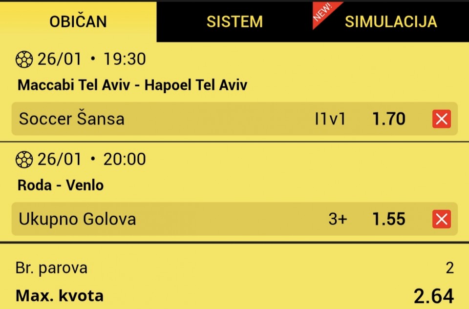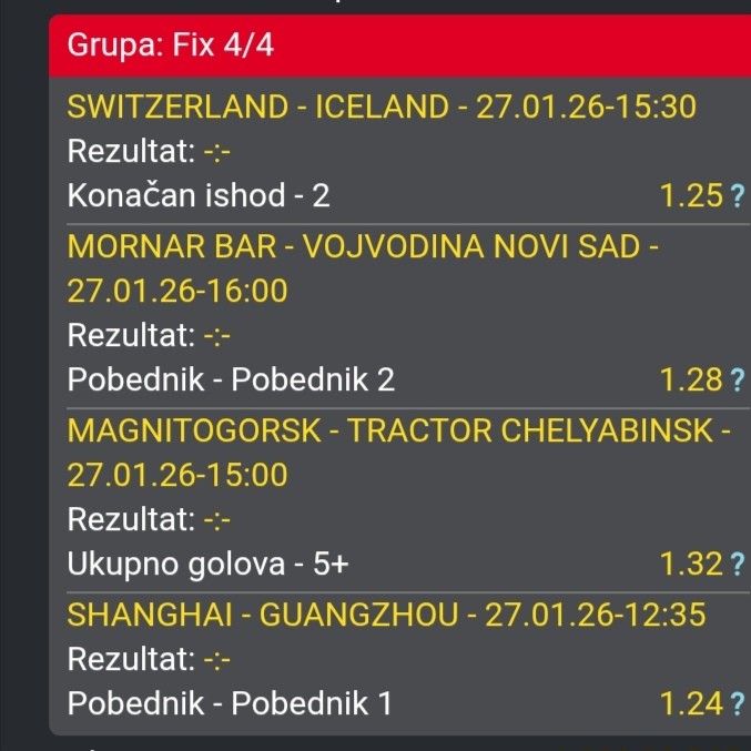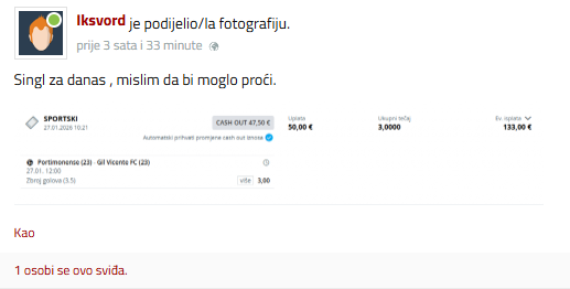 Ako neko ima u ponudi probajte 1 , ja sam probao u Volcano 2/1 na 16 kvotu ali nisam stigao da objavim jer sam kasno i uplatio. Ali nema uzivo u istu kladionicu,pokusavao sam da nadjem da uplatim jos na 1 uzivo ali ne mogu da nadjem. Kvota na...Ako neko ima u ponudi probajte 1 , ja sam probao u Volcano 2/1 na 16 kvotu ali nisam stigao da objavim jer sam kasno i uplatio. Ali nema uzivo u istu kladionicu,pokusavao sam da nadjem da uplatim jos na 1 uzivo ali ne mogu da nadjem. Kvota na Karlovac bila 1,50 a 4+ oko 1,60 , vredi probati Show more