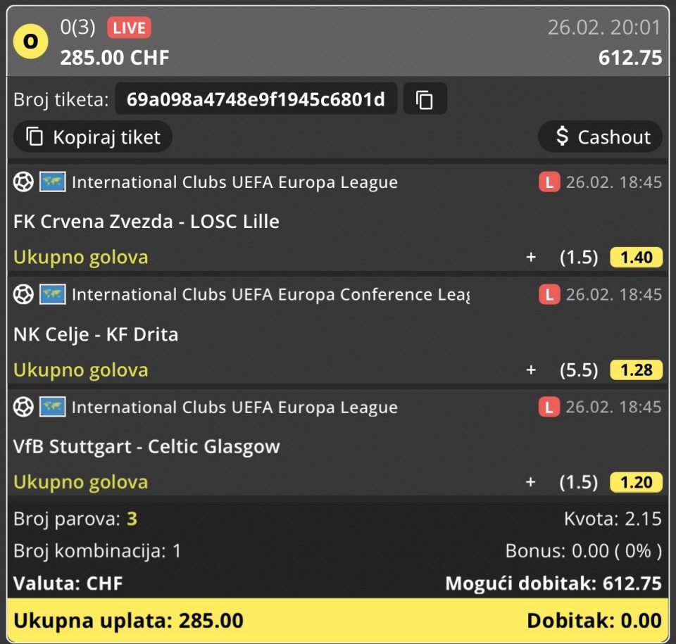 Znaju naše "velike" kladionice da u lajvu uopšte ne ubace meč ili da u drugoj trećini nema uopšte ponuda za 2+ zato potrebno da imate račune i u drugim kladionicama 2 hours 21 minutes ago