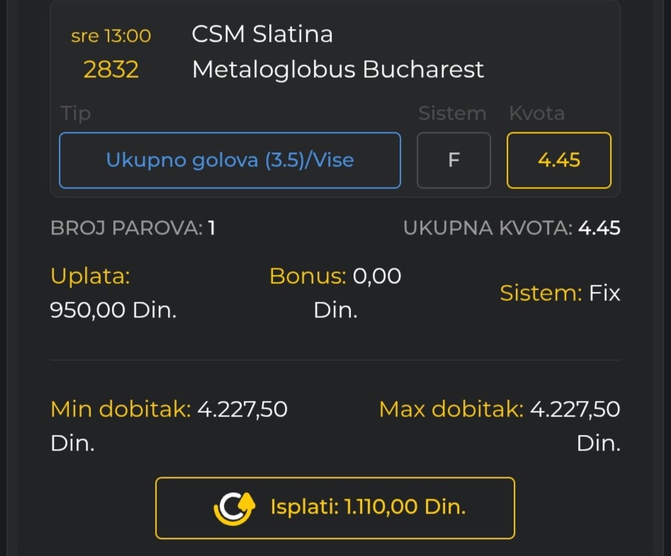 Tiket pravi domacinski, a kvota 12.63… sta ce covek vise od...Juce polovicno, obzirom na moju pohlepu blaga katastrofa… aj danas da vidimo sta ce da kaze: